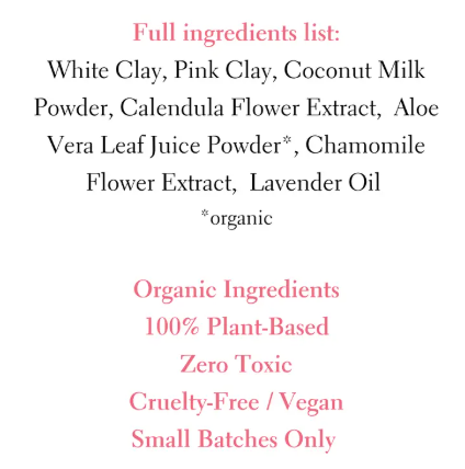 __ Quiet Renewal Mask __ This advanced clay mask combines the mineral-rich benefits of Australian Pink Clay with a carefully selected botanical blend designed to restore skin balance and vitality. Australian Pink Clay is renowned for its gentle yet effective detoxifying properties, drawing out impurities without over-stripping the skin's natural moisture barrier. The formula is enhanced with three powerhouse botanicals: Chamomile calms inflammation and soothes irritation, Aloe Vera provides deep hydration and supports the skin's natural repair processes, and Calendula promotes healing while strengthening the skin's resilience. Together, these ingredients work synergistically to address multiple concerns—from congestion and dullness to sensitivity and dehydration. Ideal for weekly treatments or targeted applications, this mask delivers professional-grade results suitable for all skin types, leaving your complexion clarified, nourished, and visibly renewed.